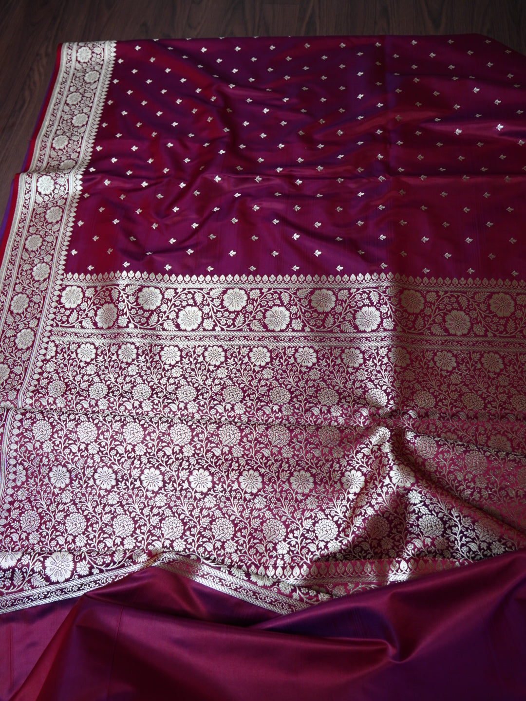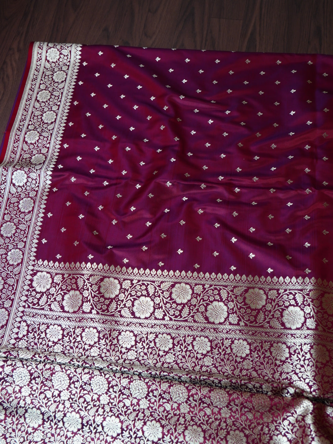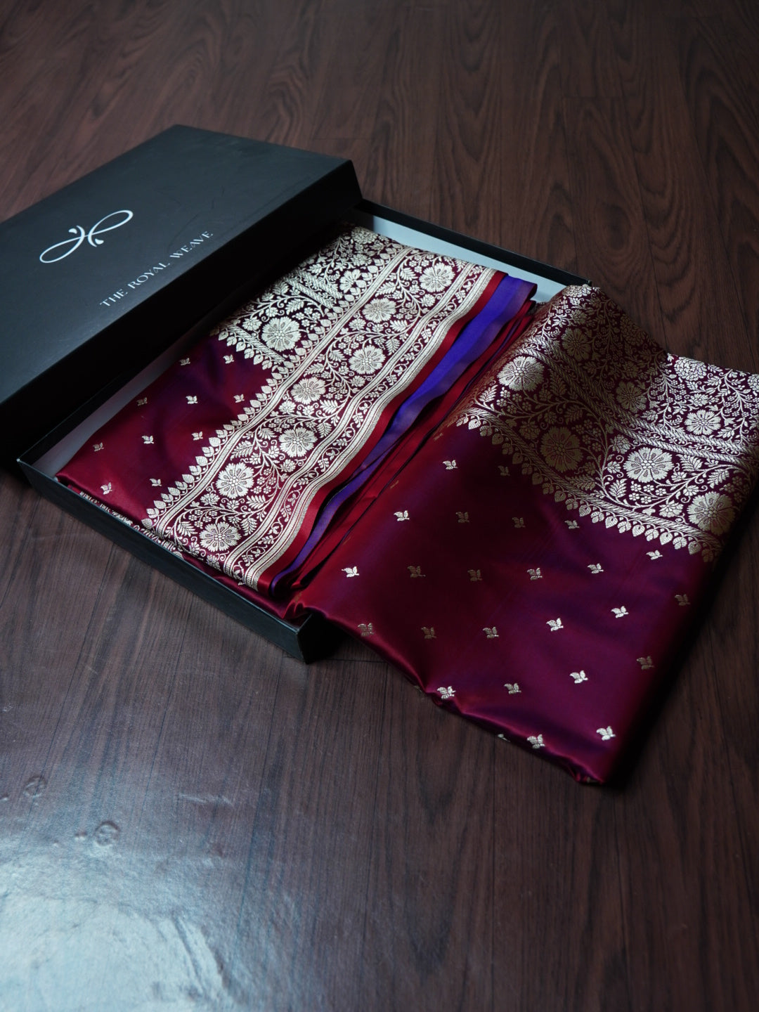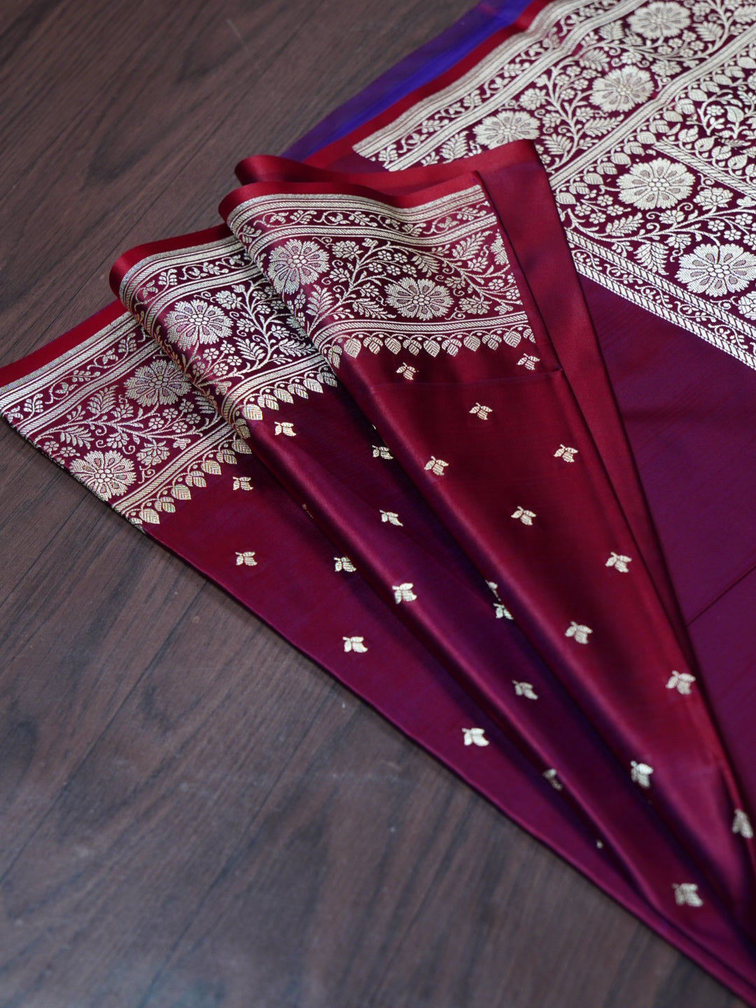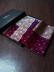 This exquisite Banarasi saree is crafted from premium Mashru Katan Silk, featuring a stunning dual-tone effect of red and purple that shines differently with every drape. The rich texture and luxurious sheen reflect the timeless artistry of Banaras, making it a perfect choice for festive occasions and grand celebrations.